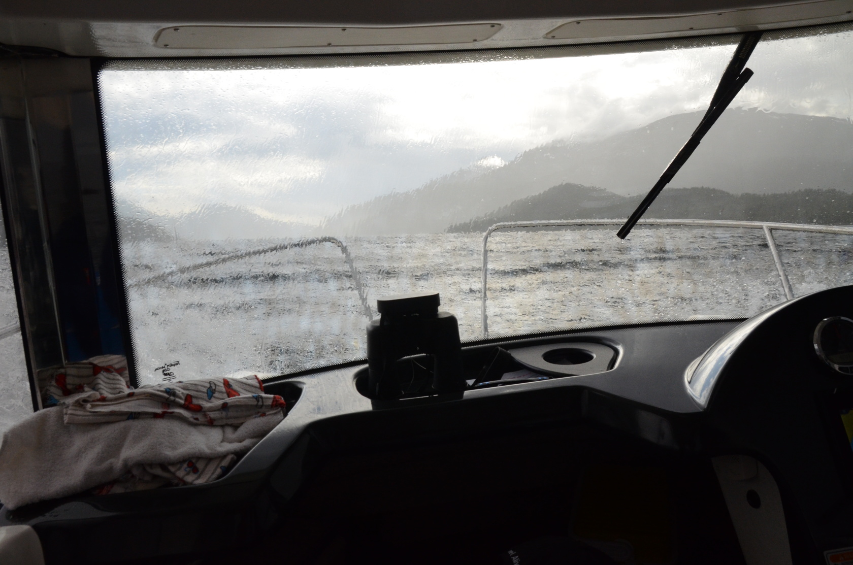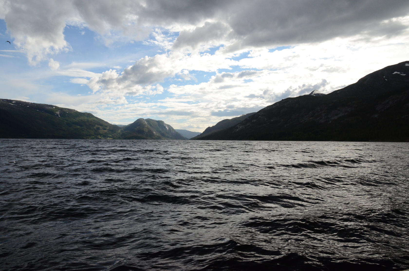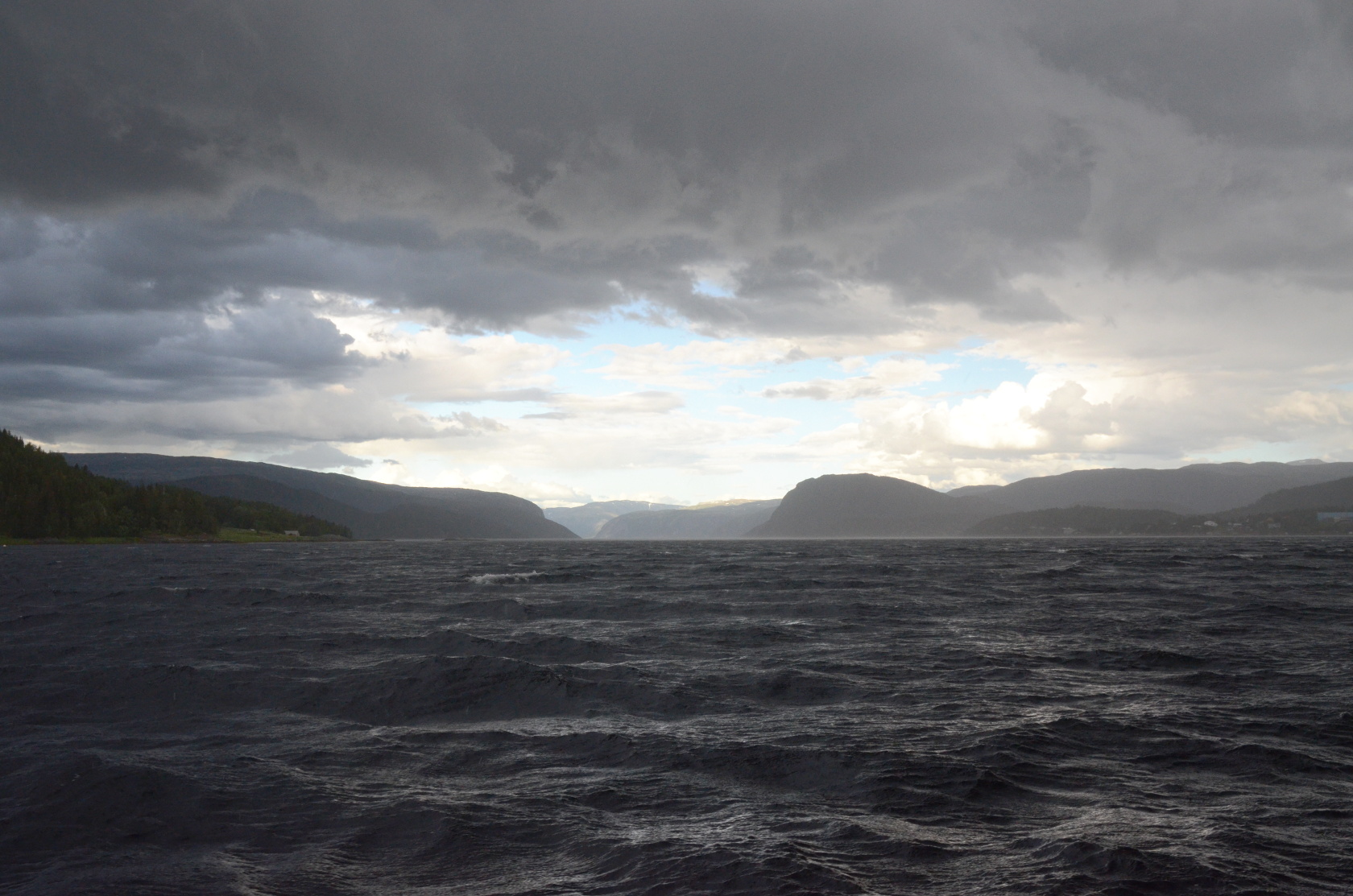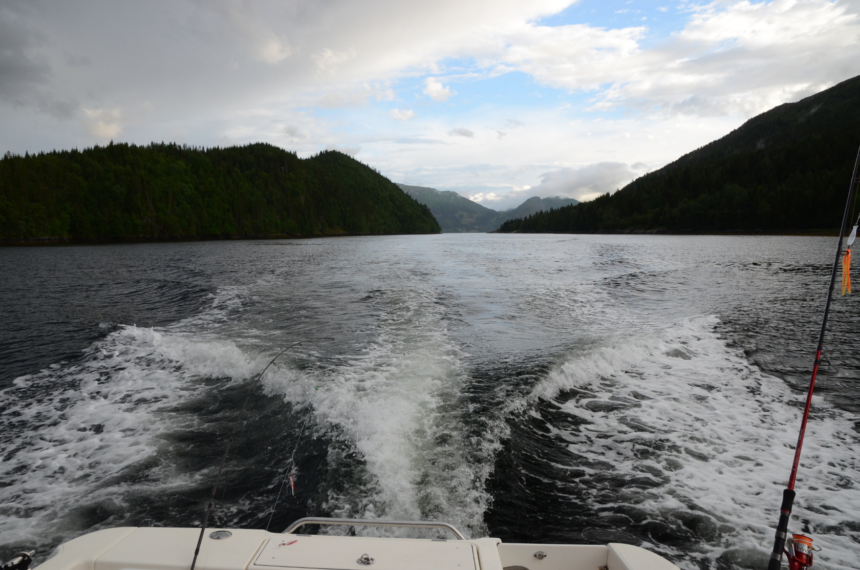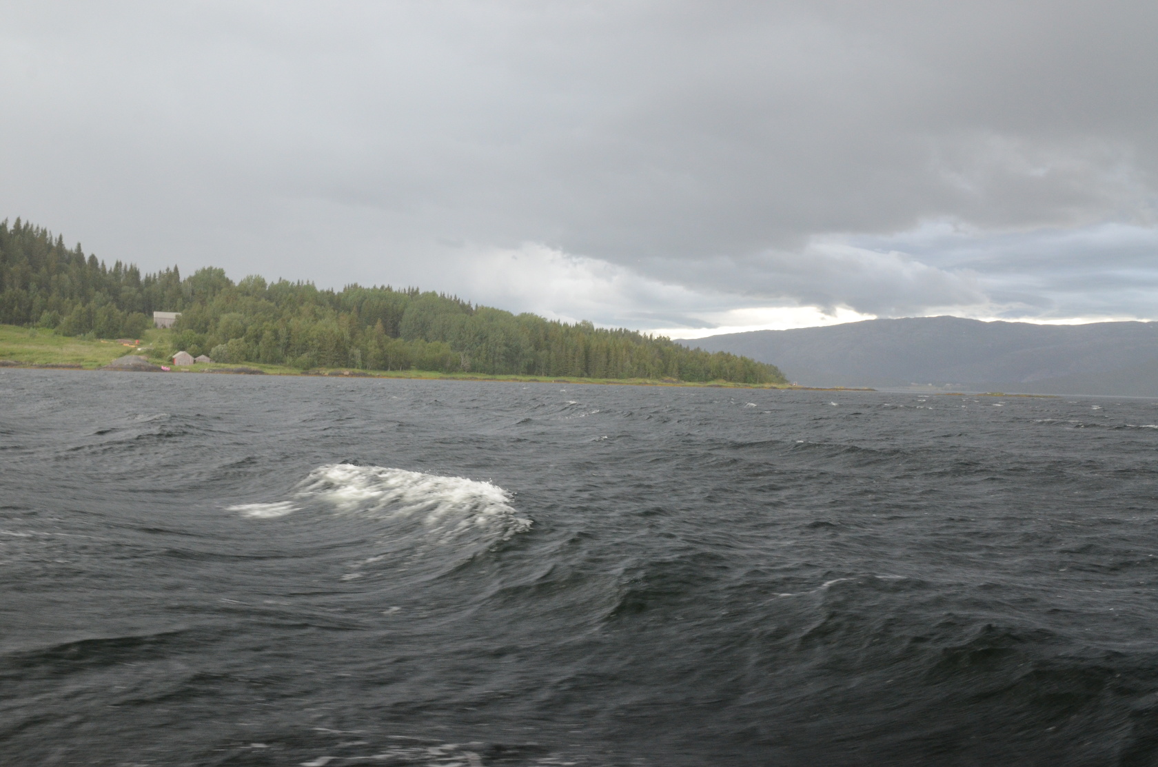 Noch bei besten Wetter ging es hinaus. Wir hatten noch keine Rute rausgeworfen und sahen uns genötigt, die erste Position wieder zu verlassen. So flüchteten wir mit dem Wind und den Wellen vom Unwetter weg, welches uns aber bald einholte.