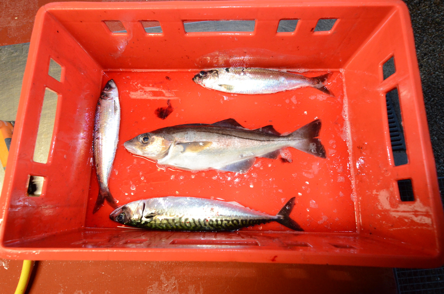 Hier der Fang des ersten Tages nochmal zusammengefasst: Pollacks, Dorsche, Seelachse, Makrelen und Heringe.