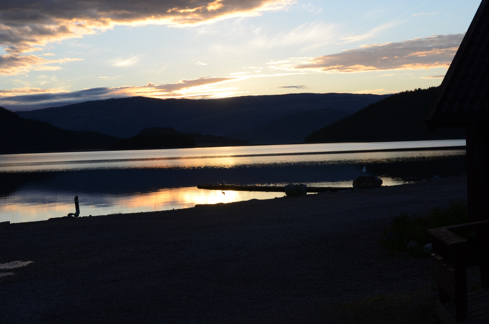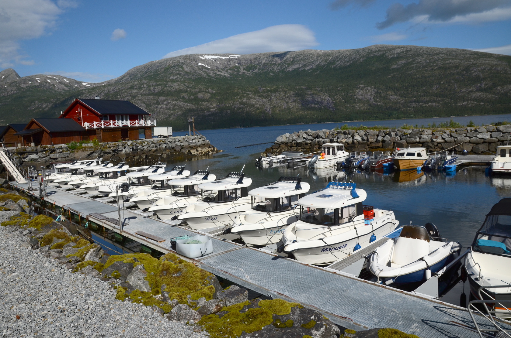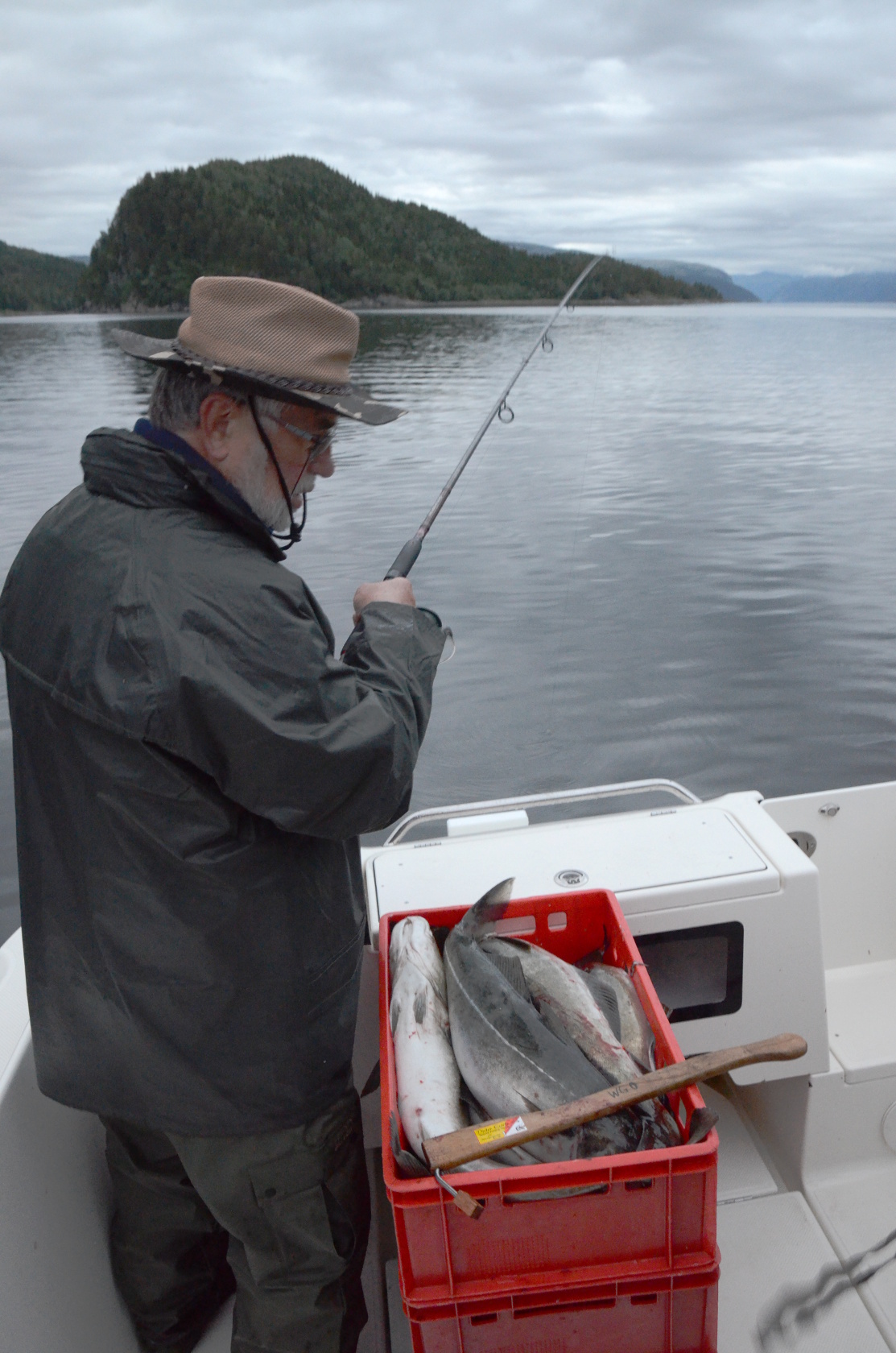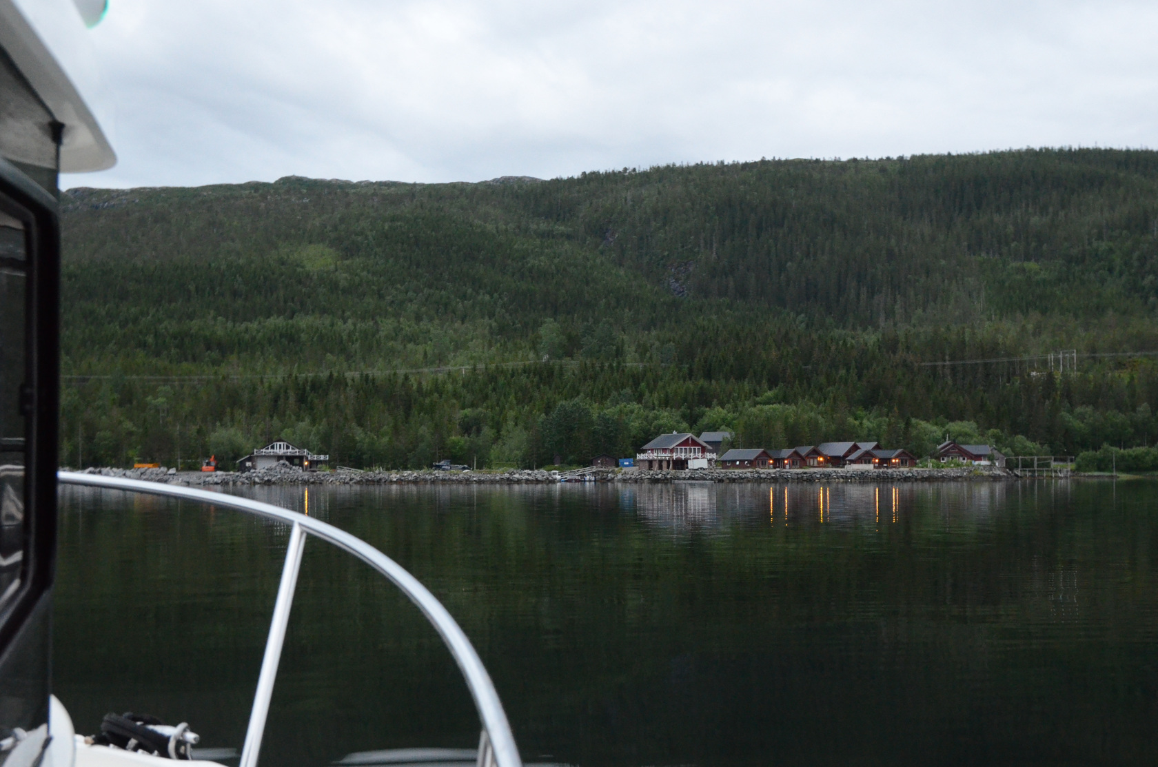 Am Sonntag standen wir gegen 8 Uhr auf und nach dem ersten Frühstück in unserer Hütte ging es zur Bootsübernahme. Von den Betreuern vor Ort erfuhren wir, dass eine Angelgruppe, die mit dem Flugzeug anreisen wollten, später kommen werden. Deren Flug wurde annulliert und die nächste Option einer Anreise ergab sich am Dienstag (3 Tage später als geplant). Später erfuhren wir, dass ein paar Angelfreunde komplett storniert hatten. Das Chaos an den europäischen Flughäfen! Für uns hieß das, ein fast leeres Camp und weniger „Konkurrenz“ im Fjord.