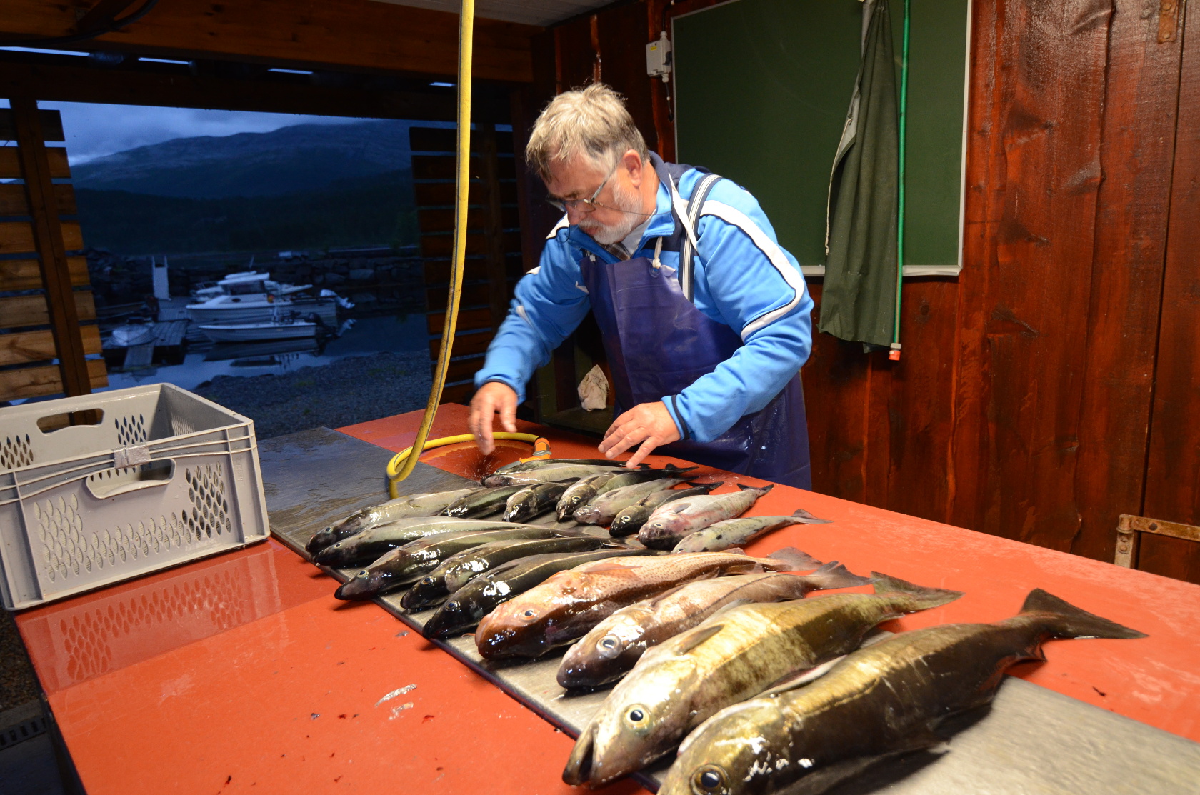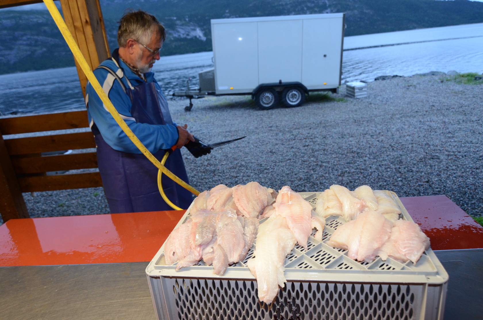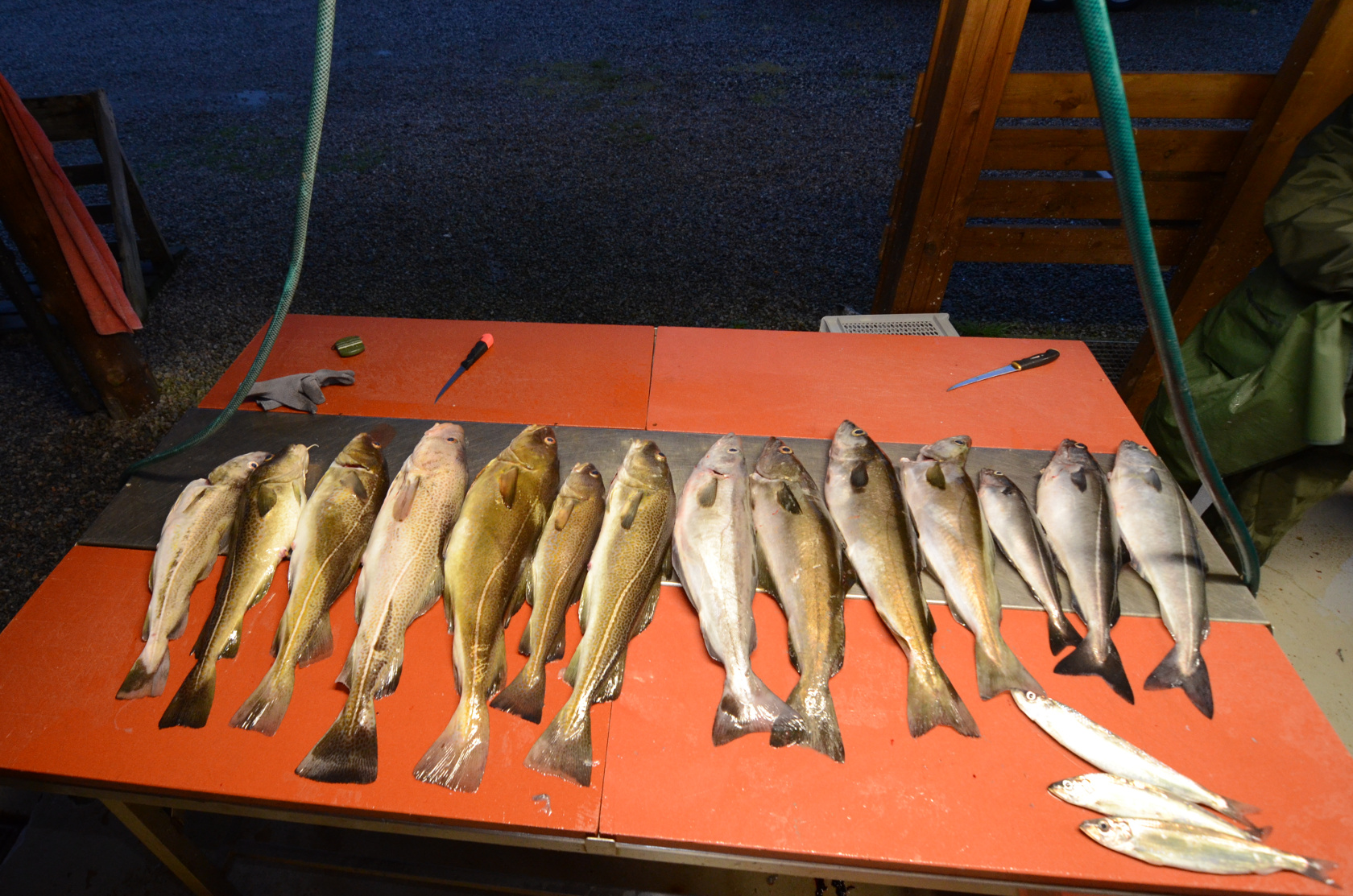 Gegen 1 Uhr kamen wir zurück und es ging an den Filetiertisch. Da die andere Reisegruppe noch auf ihren Flug nach Norwegen wartete, waren wir fast die einzigen, die den Tisch beanspruchten. Das wird sich sicher ändern, wenn alle Angelfreunde ihren Fang am Tisch zerlegen wollen. Wie auf den Fotos zu sehen ist, war unsere Kiste diesmal auch gefüllt: 14 Seelachse, ein Schellfisch, ein Dorsch und zwei Pollacks. Auch ich hatte an diesem Tag mit einigen Seelachsen meinen Anteil.