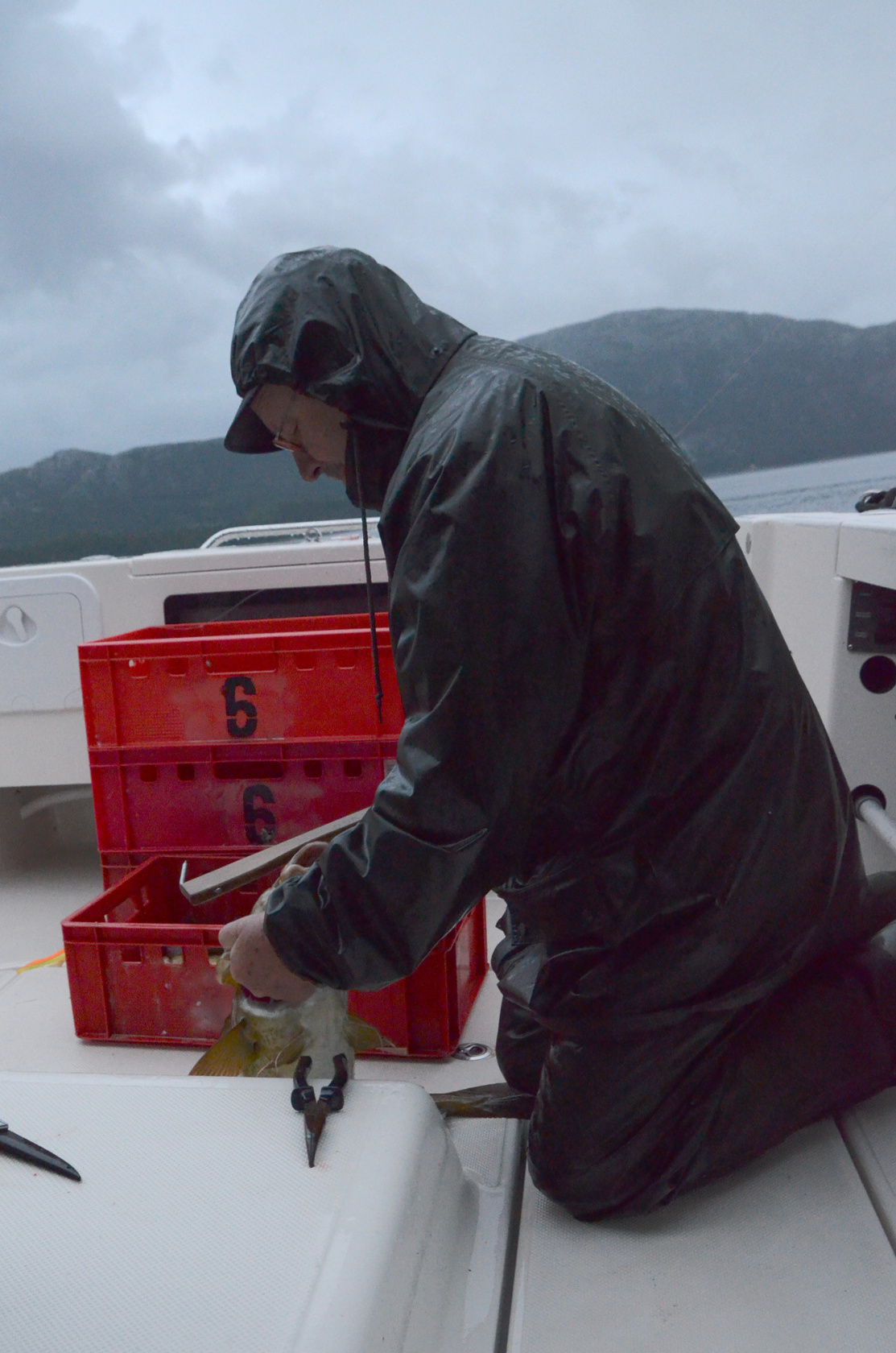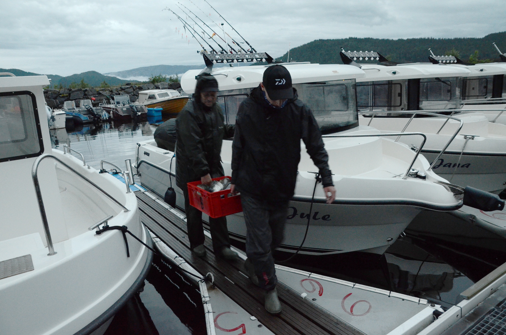 Aufgrund des ständigen Regenwetters hatte ich die Kamera nicht oft schussbereit und daher kaum Fotos gemacht. Yannik angelte mit einem Gummiköder ohne Paternostervorfach und war wieder erfolgreich. Einmal hing an seinem Haken ein Dorsch und er rief: "Schaut, da ist ein Heilbutt." Wir schauten ins Wasser und sahen tatsächlich einen Heilbutt, der mit dem Dorsch am Haken schwamm. Der Heilbutt hatte eine geschätzte Körperlänge von 120 Zentimeter. Sofort steckte jeder von uns seine Angel in die Halterung, um beim Einholen behilflich zu sein. Leider hatte sich der Heilbutt nicht verbissen, sondern griff nur den am Haken schwimmenden Dorsch an. Sobald Yannik den Dorsch ans Boot zog, tauchte er ab und verschwand. Trotzdem war das ein beeindruckendes Erlebnis, keiner von uns hatte bisher einen so großen Heilbutt gesehen.