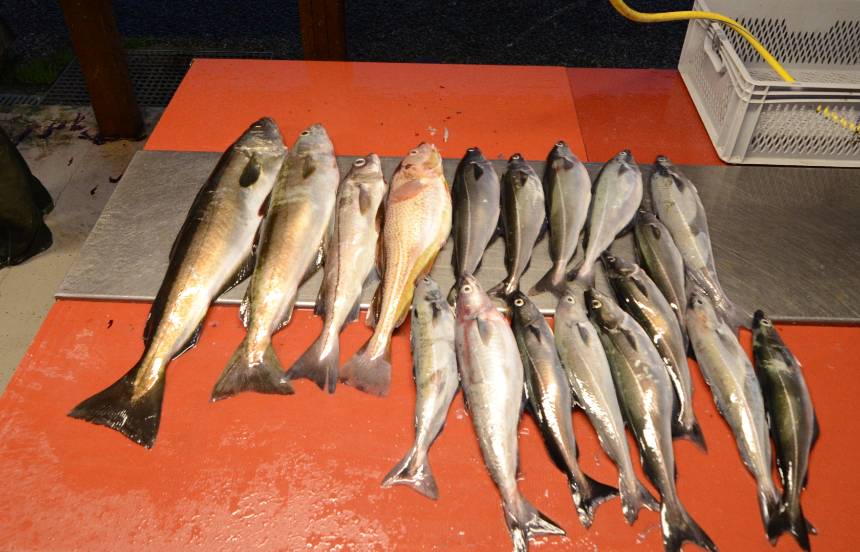 14 Seelachse, ein Schellfisch, ein Dorsch und zwei Pollacks.