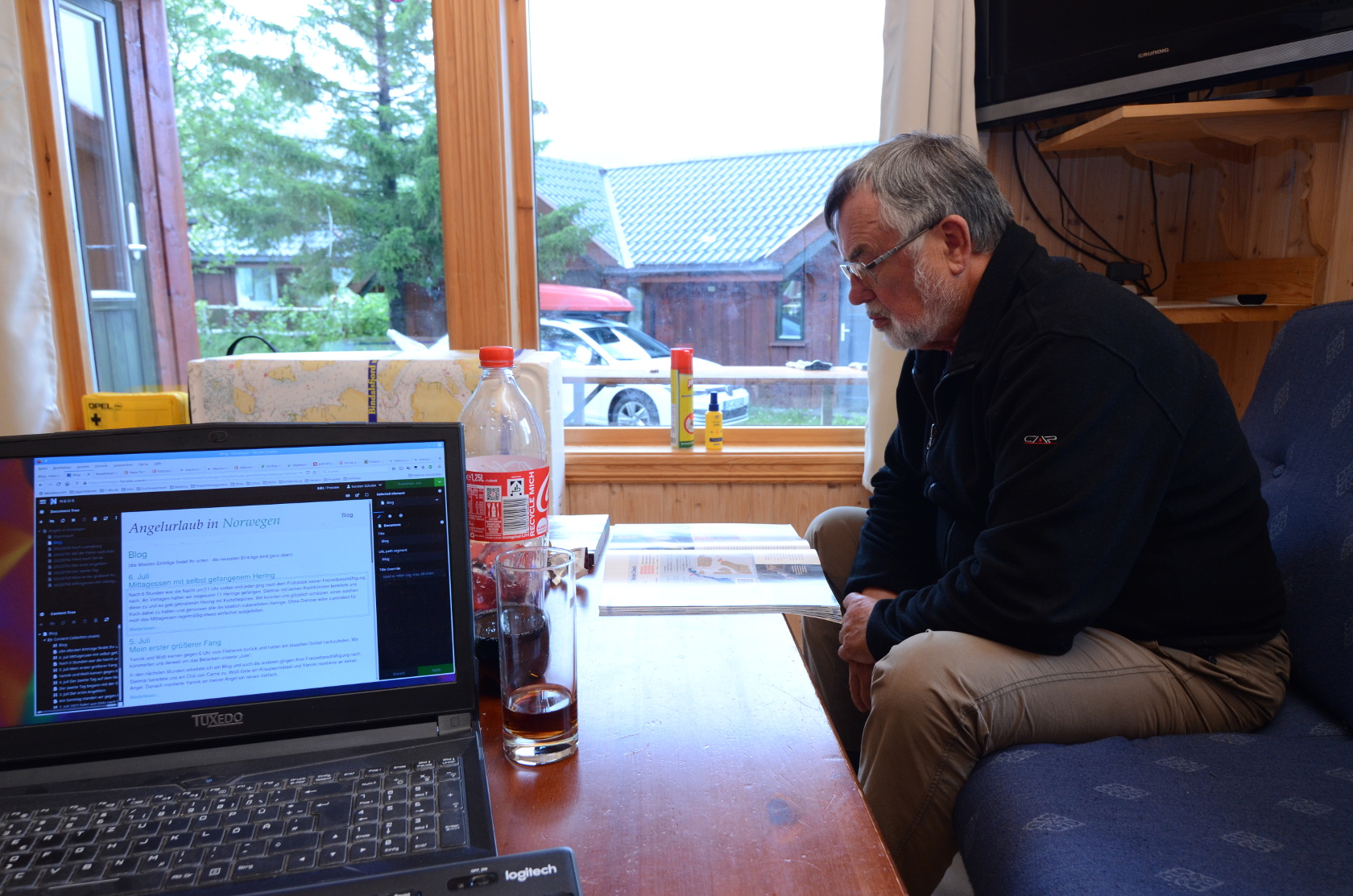 Ich schreibe am Block und Dietmar liest in einer Angler-Zeitschrift.