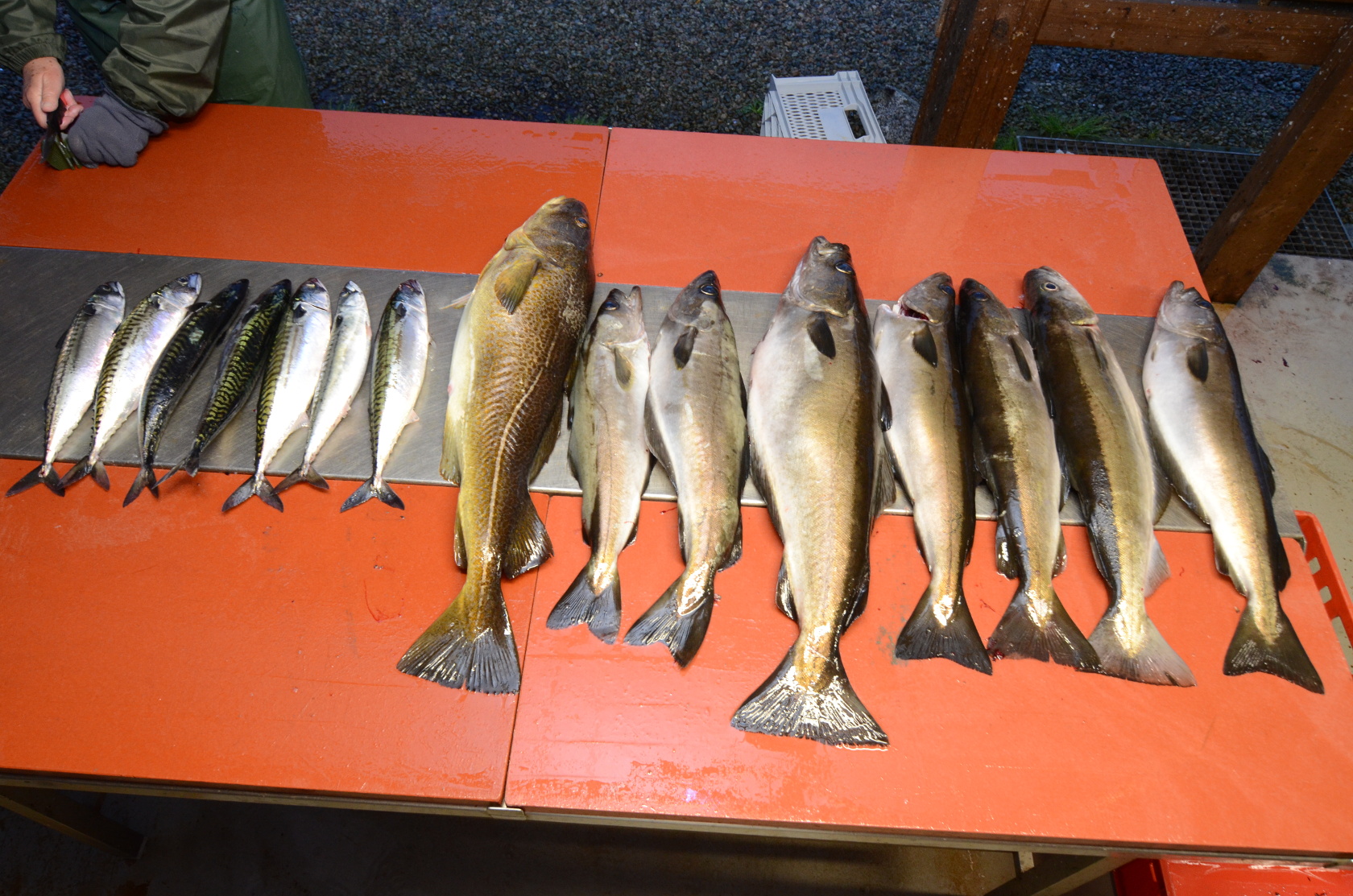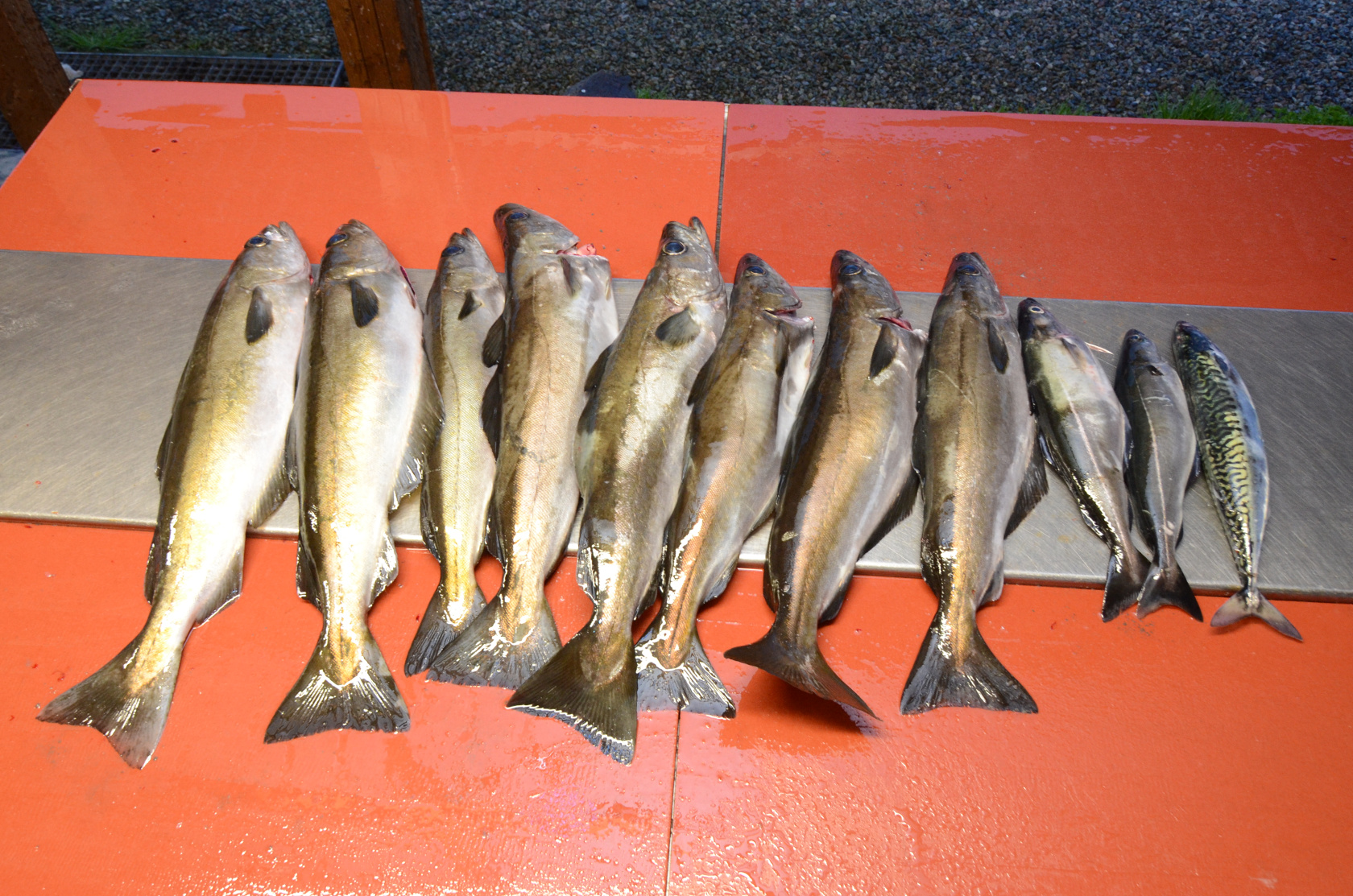 Der Fang von Dietmar und mir: acht Pollacks, zwei Seelachse und eine Makrele.