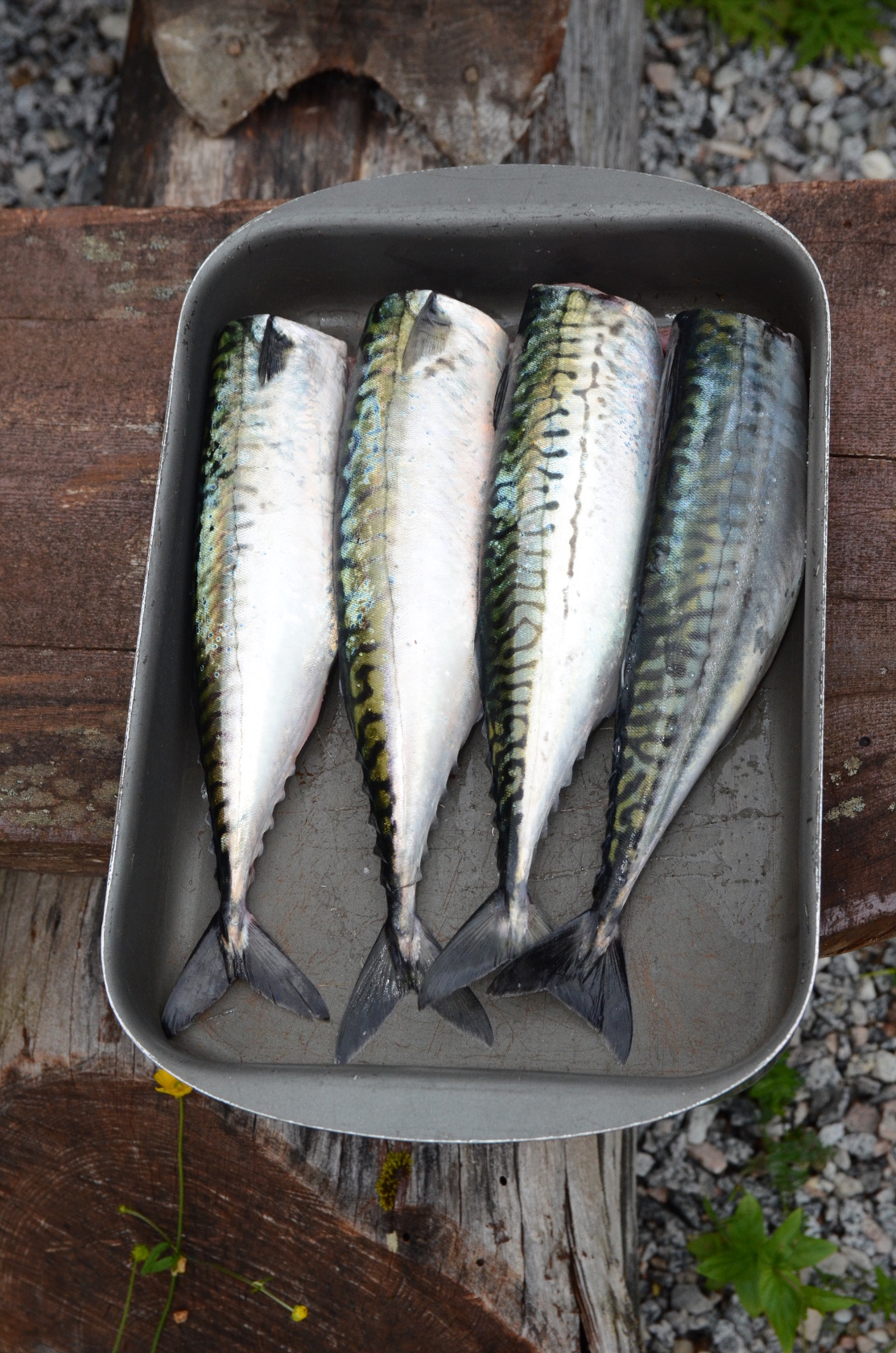 Wir grillten diese vier selbst gefangenen Makrelen über eine Feuerschale.