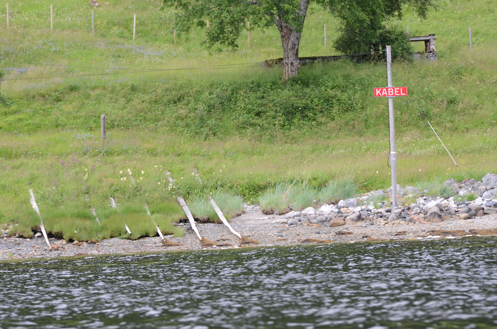 All diese Gebäude mussten mit Strom und Telefon und Internet versorgt werden. Immer wieder gab es Stellen wie diese, einer Markierung für Unterwasserkabel.