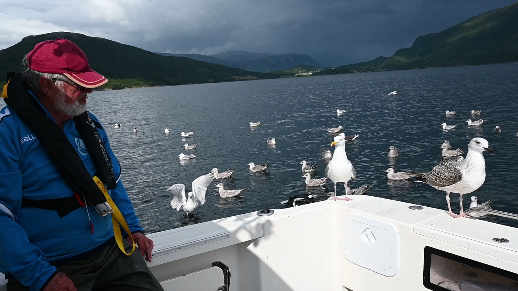 Wieder draußen nahm Dietmar die gefangenen Fische aus und warf die Eingeweide in den Fjord. Bei dieser "Fütterung" waren ein paar Möwen mutig und setzen sich in Armlänge von uns aufs Heck des Bootes und hofften leckere Happen zu ergattern.